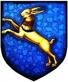 | Clevland: Azure, a hare salient or collared gules pendent therefrom a bugle horn stringed sable. Arms of William Clevland (1664-1734) of Tapeley Park, Westleigh, near Bideford, another son-in-law of John Davie. He was a Scottish-born Royal Navy commander who served as Controller of Storekeepers' Accounts (1718-1732).[41] In 1702, having sailed into the North Devon port of Bideford, then one of the leading tobacco importation ports of Great Britain, he is said to have viewed from his ship the ancient mansion of Tapeley, in the parish of Westleigh, situated on an eminence overlooking the estuary of the River Torridge, and to have been so impressed by the beauty of its position that in 1704 he purchased the estate from the Giffard family of Brightley, which thenceforth he made his residence.[42] His son purchased the lordship of the manor of Bideford,[43] which thenceforward descended with the Tapeley estate, which is still owned and occupied by his descendants (via two female lines) the Christie family, also of Glyndebourne House, East Sussex. | ||||