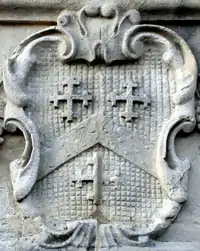 | Crossing:(?) A chevron between three cross crosslets (unknown). Apparently Crossing of Exeter, given similarly by Vivian as Or, on a chevron azure between three crosses crosslet fitchée gules as many bezants[39] which family was heir to the Dodderidge family of Barnstaple and of Bremridge, South Molton. Hugh Crossing was Mayor of Exeter in the 17th century[39] and his eldest son Francis Crossing (c.1598-1638) was Member of Parliament for Mitchell in 1626 and for Camelford in 1628.[40] | ||||