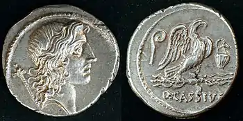 | Silver denarius struck by Quintus Cassius Longinus in Rome 55 BC.