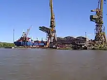 The Rio Santiago Shipyard is a shipyard located in the city of Ensenada, Buenos Aires Province at the shores of the Santiago River. Currently owned by the Government of Buenos Aires Province, it has been one of the major active and important shipyards in Latin America. Founded in 1953, it has realized diverse functions in the naval, industrial and railroad sectors. In its golden age the shipyard reached 8,000 workers on double shift. In 2008 relies on 2,700 workers.