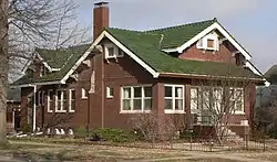 The R.O. Stake House is a historic house in Lincoln, Nebraska. It was built in 1919 by Reese O. Stake, and designed in the American Craftsman style by architect George A. Berlinghof.[2] Stake built many houses in Lincoln, including his own house.[2] According to the National Register of Historic Places form, "The bungalow has textured brown bricks cladding the structural-tile walls of the exterior, with restrained limestone trim on the south chimney and front steps. The wide eaves have stuccoed soffits and the raking eaves have substantial wooden brackets. The complex, interlocking gable roofs are permanently finished in glossy, green-glazed tiles."[2] The house has been listed on the National Register of Historic Places since April 27, 2005.[1]