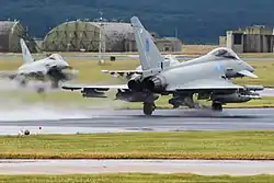 On 4 March 2016 Lossiemouth was announced as the preferred option to accommodate an additional Typhoon squadron and 400 personnel.[66] Four Typhoon FGR4s were assigned to No. 9 Squadron (Designate) at Lossiemouth in February 2019.[67] The unit re-equipped as an aggressor and air defence squadron operating Typhoon Tranche 1 on 1 April 2019, thereby continuing in unbroken service upon the Tornado's retirement at RAF Marham.[68][69][70][71]