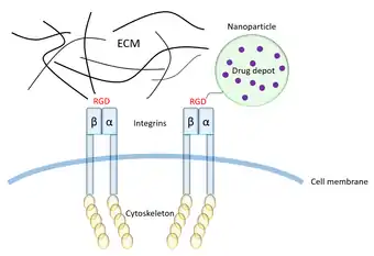 Conventional drug delivery methods, such as systemic or topical delivery, are associated with many issues such as low solubility, off-target effects, and disadvantageous pharmacokinetics. Nanoparticles have been employed to increase solubility and target delivery of the drug to the desired tissue, increasing concentration of the drug at the site of action and decreasing drug concentration elsewhere, thereby increasing the efficacy of the drug and decreasing side effects.[27][3] RGD has been employed to target nanoparticles containing drugs to specific cell types, especially cancer cells expressing integrin αvβ3.[3]
