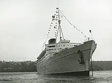 The brand-new RMS Caronia made her maiden voyage on 4 January 1949 between Southampton and New York.[5] Two more transatlantic crossings followed before the ship embarked on her first cruises from New York to the Caribbean. During her first years she spent most of the year on transatlantic crossings; only during the winter was she engaged in cruising. In 1951 she made her first world cruise. From 1952 onwards she made transatlantic crossings only in August and September, with the rest of the year dedicated to cruising; during one such cruise, she ran aground in Egypt on 12 March 1952 while transiting the Suez Canal.[6] In May 1953 Caronia made what was perhaps her most famous cruise, associated with the coronation ceremony of Queen Elizabeth II (who had christened Caronia six years earlier). The ship was used as a hotel, as most of the accommodation in the United Kingdom was fully booked.