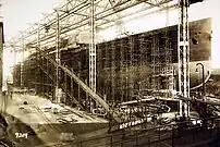 On June 10, 1913, the first ship of the Imperator-class trio, SS Imperator, made its maiden voyage.[6] The second, a slightly larger liner, SS Vaterland, did the same in May 1914.[7] The last of the trio was decided to be named Bismarck. Her keel was laid shortly after the launch of the Vaterland, in the spring of 1913, in the Blohm & Voss shipyards in Hamburg, Germany, under the watchful eyes of Kaiser Wilhelm II.[8] The original project called for the Bismarck to be similar to the Vaterland, which itself differed from the Imperator in several ways, including the fact that the ducts of its chimneys did not descend into the center of the ship, but split into smaller pipes that run along its sides, allowing for larger interior spaces. Bismarck was intended to be the same size as Vaterland, in both tonnage and length, but a miscommunication that Cunard's Aquitania would be larger made HAPAG demand an extra 6 feet (1.8 m) in length, increasing her gross tonnage. This purported news had already prompted the company to bolt an eagle-shaped figurehead to the Imperator in order to gain some precious meters.[9] In reality, Aquitania was 50 feet (15 m) shorter than both Vaterland and Bismarck. As an employee of HAPAG noted with annoyance, these six feet were particularly expensive, since they required a total revision of the plans and the addition of two couples in the center of the ship to allow this modification of the structure.[10] However, this allowed Bismarck to remain the largest liner ever built until the completion of SS Normandie in 1935.[11]