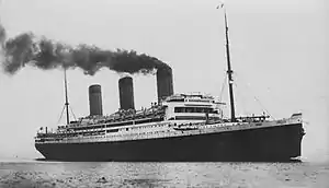 After launch, fitting out of Bismarck proceeded until the start of the First World War in August 1914, when it slowed and substantive work on the vessel stopped altogether.[12] Other than maintenance work, not much more work was done on the vessel, as naval priorities occupied the ship yard until 1918. By the time the war was over, the funnels had still not been erected. During the war, brass and copper components were scavenged from the Bismarck for munitions.[14] After being ceded to Britain under the terms of the Treaty of Versailles, the as-yet uncompleted ship was purchased jointly by the White Star and Cunard Lines, together with Imperator.[15] Construction of the ship resumed after the end of World War I. Bismarck was ostensibly a replacement for the pre-war 48,000-ton Olympic-class ocean liner Britannic which was lost after hitting a mine in the Aegean in 1916, while the Imperator went to Cunard and became the RMS Berengaria, a replacement for the Lusitania which had been sunk by a German U-boat in 1915.[16]