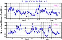 A broad-band optical light curve for RU Lupi, adapted from Siwak et al. (2016)[1]