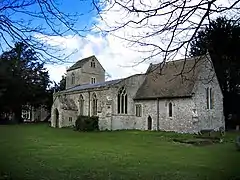 The earliest parts of the Church of England parish church of Saint Lawrence are 12th-century.[7] The Baptismal font is Norman.[8] The gable-roofed west tower has characteristic Norman features including a round-headed arch to the nave.[8] The chancel is Early English Gothic of the early 13th century, with single lancet windows in the north and south walls[7] and a double lancet window to the east.[8]