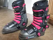 With the introduction, between 1969 and 1972, of the Nordica Astral and Grand Prix designs, these "front-entry" style boots achieved their modern form, with a removable innerboot that could be customized for precise and comfortable fit. Martin-style buckles provided the force necessary to close the stiff plastic shells. New buckle designs and other adjustments have been added, but today's overlap race boots look remarkably like the original Nordica Grand Prix.[5] In 1976 Nordica introduced its own series of three-piece designs.