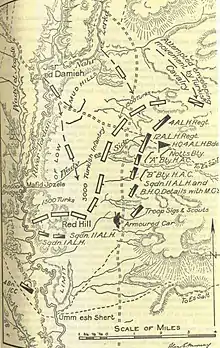 After the withdrawal from Amman, the British infantry continued operations in the Judean Hills, launching unsuccessful attacks towards Tulkarem between 9 and 11 April with the aim of threatening Nablus.[20] Also on 11 April, the Ottoman 48th Infantry Division, reinforced by eight squadrons and 13 battalions, unsuccessfully attacked the Anzac Mounted Division and the Imperial Camel Corps Brigade, supported in turn by the 10th Heavy Battery and 301st Brigade Royal Field Artillery, in and near the Jordan Valley, at the Ghoraniyeh and Aujah bridgeheads and on Mussallabeh hill.[21][22][23] Between 15 and 17 April, Allenby's Hejaz Arab force attacked Ma'an with partially successful results.[24]