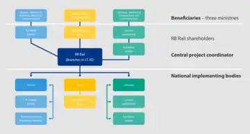 The beneficiaries of the Rail Baltica project are ministries of the three Baltic States: Estonia's Ministry of Economic Affairs and Communications, Latvia's Ministry of Transport, and Lithuania's Ministry of Transport and Communications. In 2014, they established RB Rail AS, a joint venture that acts as the main coordinator and project implementer for the project. Its main business is the design, construction, and marketing of the railway. RB Rail AS also submits EU financing proposals for the Rail Baltica purchasing body for all parties for the procurement of studies, plans, designs for the Global Project, sub-systems (control, command, and signalling and energy/electrification), raw materials, key components, and cross-border track sections.[30]