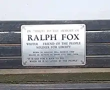 Ralph Winston Fox (30 March 1900 – 28 December 1936) was a British revolutionary, journalist, novelist, and historian, best remembered as a biographer of Lenin and Genghis Khan. Fox was one of the best-known members of the Communist Party of Great Britain (CPGB) to be killed in Spain fighting against the Nationalists in the Spanish Civil War.