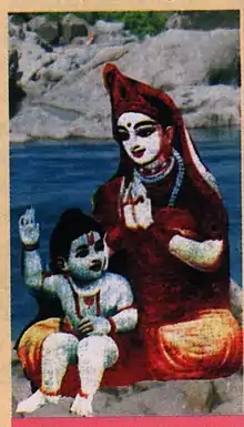 On reaching Ayodhya, the Queen started praying to God Ram close to Laxman Fort near Sarayu river. She ate only fruits, then she gave up fruits and ate only leaves, and eventually she gave up all food. The Queen fasted and prayed for about a month but God Ram did not appear, so eventually in despair, she jumped into the river at midnight. Just then something magical happened and God Ram appeared in child form in the Queen's lap.