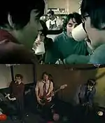 Top: the original video, the band with an actor representing "Raoul". Bottom: the band performing "Raoul" at an office party in the re-release music video.