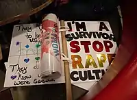 Two movements have addressed what they either fully or partially perceive as being rape culture or a role being played by rape culture, i.e. SlutWalk and Me Too. Though their rationale for claiming and including that the role of rape culture as being party to the particular social blights and crimes that they are fighting can vary, these movements have helped spread people's stories through hashtags[10] and provide an online space where victims of different types of sexual violence can confide in each other.