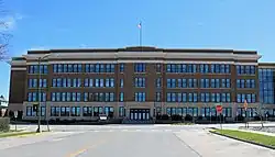 By the beginning of the 20th century, there were growing concerns of low literacy in Rapid City. In 1915, most residents had only been given a basic education; about 10% of the population had graduated high school, and only 158 people in the entirety of Pennington County held college degrees.[8] Multiple school buildings have been built on the present-day school site, but the remaining one, built in 1923, is the only building that has survived. This complex served as Rapid City's only public high school until 1969.[8] The first school building here was built in 1882, a three-story Second Empire structure that served as Rapid City's first high school until it burned down in 1917. A second campus building was added in 1913;[4] President Calvin Coolidge visited the Black Hills during the summer of 1927 and established his temporary offices there as his "Summer White House". Coolidge wrote his "I do not choose to run" speech at this building,[9] and two years later, it was renamed to Coolidge High School in his honor.[4] Washington Elementary School was added to the complex about 1918.[10]