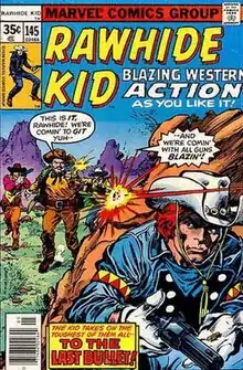 The Rawhide Kid debuted in a 16-issue series (March 1955-Sept. 1957) from Marvel Comics's 1950s predecessor, Atlas Comics.[1] Most of the covers from the series were produced by Joe Maneely or John Severin, though a handful were done by Russ Heath or Fred Kida. Interior art for the first five issues was by Bob Brown, with Dick Ayers at the reins thereafter.[2][3]