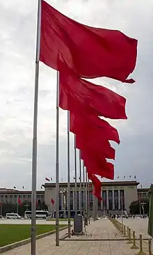 It has been common to find streets, buildings, businesses and product brands named after the Red Flag in nominally socialist countries as a result of recuperation. For example, a famous line of limousine cars manufactured by China FAW Group Corporation has the brand name of Red Flag. In 1967 during the Cultural Revolution, Pilal in Akto County, Kizilsu, Xinjiang, China was renamed Hongqi Commune (红旗公社), meaning 'red flag commune'.[12] In 1968, Baykurut Commune in Ulugqat County, Kizilsu, Xinjiang, China was also renamed Hongqi Commune.[13][14]