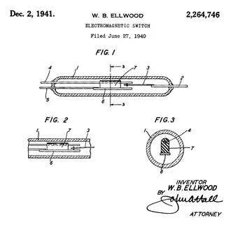 The reed switch[lower-roman 1] is an electromechanical switch operated by an applied magnetic field. It was invented in 1922 by professor Valentin Kovalenkov at the Petrograd Electrotechnical University,[1] and later evolved at Bell Telephone Laboratories in 1936 by Walter B. Ellwood into the reed relay. In its simplest and most common form, it consists of a pair of ferromagnetic flexible metal contacts in a hermetically sealed glass envelope. The contacts are usually normally open, closing when a magnetic field is present, or they may be normally closed and open when a magnetic field is applied. The switch may be actuated by an electromagnetic coil, making a reed relay,[2] or by bringing a permanent magnet near it. When the magnetic field is removed, the contacts in the reed switch return to their original position. The "reed" is the metal part inside the reed switch envelope that is relatively thin and wide to make it flexible, resembling the reed of a musical instrument. The term "reed" may also include the external wire lead as well as the internal part.[lower-roman 1]
