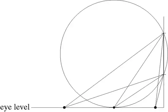 If the viewer stands too close to the wall or too far from the wall, the angle is small; somewhere in between it is as large as possible.
