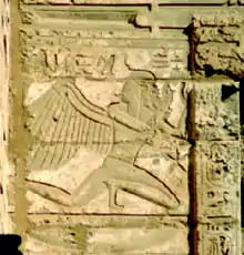 - ↑ Sonderzeichen U 103 gemäß Petra Vomberg: Sonderzeichenliste In: Rainer Hannig: Großes Handwörterbuch Ägyptisch-Deutsch : (2800 - 950 v. Chr.). von Zabern, Mainz 2006, ISBN 3-8053-1771-9, S. 1448.