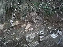 Loss of soluble minerals leaves the upper part of the soil enriched in insoluble materials, particularly clay minerals.[6] At the same time, biological activity leads to an accumulation of humus in the surface soil, which is protected from further decomposition by the clay.[7] The upper soil horizon of a rendzina therefore contains considerable amounts of humus.[7] It can also be relatively carbonate- or gypsum-rich, although at levels much lower than in the rocky parent material. Progressive breakdown of the parent material and loss of carbonate or gypsum will ultimately convert a rendzina into another soil type. Since these processes occur relatively fast in comparison to weathering of most carbonate- and gypsum-free materials, rendzinas represent a transitory stage in soil development. However, they can persist over the long term if soil loss by erosion counteracts the soil development process.