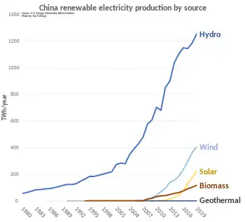 By the end of 2019, the country had a total capacity of 790 GW[20] of renewable power, mainly from hydroelectric, solar and wind power. By the end of 2019, China's hydropower capacity reached 356 GW.[21] China's installed capacity of solar power reached 252 GW and wind power capacity was 282 GW, as of 2020.[22][23]