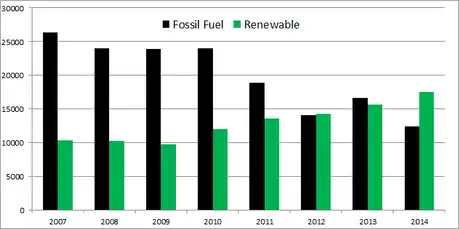 Renewable energy generation in Denmark increased from 10.4 TWh to 17.6 TWh between 2007 and 2014.[20][21][22][23][24] Fossil fuel generation fell from 26.3 TWh in 2007 to 12.4 TWh in 2014.[20][21][22][23][24] Electricity generated from renewables first exceeded electricity from fossil fuels in 2012 and again in 2014.