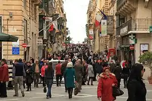 Republic Street (Maltese: Triq ir-Repubblika), historically known as Strada Reale (Maltese: Strada Rjali) or Kingsway, is a principal street in the capital city of Valletta, Malta. It is about 1 kilometer long (0.6 miles) and is known for legislative, judiciary and commercial purposes. It is mostly pedestrianised.