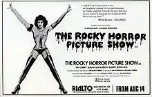 With Pink Flamingos (1972) and Reefer Madness (1936) making money in midnight showings nationwide, a Fox executive, Tim Deegan, was able to talk distributors into midnight screenings,[34] starting in New York City on April Fools' Day of 1976.[42] It was the "Secret" film, on 20 May, in the first Seattle International Film Festival.[44] The cult following started shortly after the film began its midnight run at the Waverly Theater in New York City,[41] then spread to other counties in New York, and to Uniondale, Long Island. Rocky Horror was not only found in the larger cities but throughout the United States, where many attendees would get in free if they arrived in costume. The western division of the film's release included the U.A. Cinemas in Fresno and Merced, the Cinema J. in Sacramento, the UC Theatre in Berkeley and the Covell in Modesto. In New Orleans, an early organised performance group was active with the release there, as well as in such cities as Pittsburgh, Pennsylvania, and Chicago (at the Biograph Theater). Before long, nearly every screening of the film was accompanied by a live fan cast.[45]