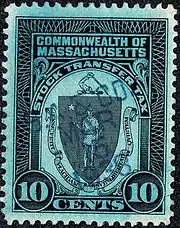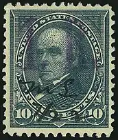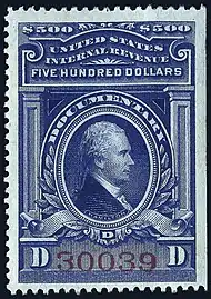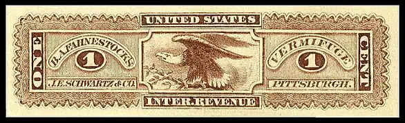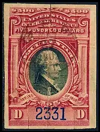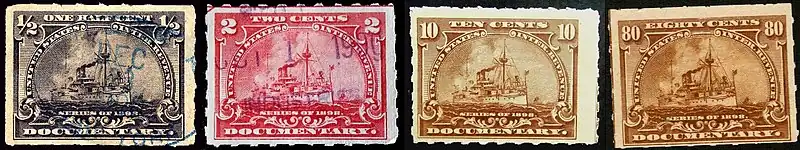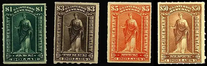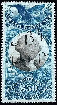 In the continuation of providing funding for the Spanish–American War Congress authorized a tax on a wide range of goods and services including various alcohol and tobacco products, tea and other amusements and also on various legal and business transactions (such as Stock certificates, bills of lading, manifests, and marine insurance). To pay these tax duties revenue tax stamps were purchased and affixed to the taxable item or respective certificate.[25][26] There are seventeen stamps in this issue which occur in denominations ranging from ½-cent to 50-dollars which were printed on double lined watermarked paper. Two types of perforations were used: Rouletted perforations and 'hyphen' shaped perforations. Numerous double transfers occur (doubled image) in this issue.[27]