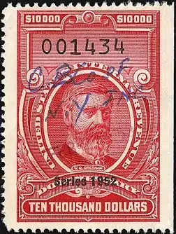 During the period from 1940 to 1958 the Department of Internal Revenue released several hundred, Documentary, revenue stamps in three basic designs with denominations that ranged from 1-cent to 10,000-dollars and with a variety of different portraits of notable statesmen, each denomination of stamp bearing a different portrait. Almost all of the issues of this period were printed in "carmine" red. The higher denominations of 30-dollars to 10,000-dollars bore a unique serial number as an added security measure. A few reprints from 1917 were also issued during this period.[33]