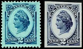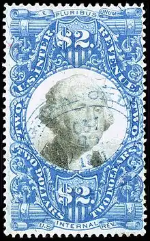 In 1875, the Internal revenue department issued a 2-cent revenue, depicting an allegory of Liberty. Printing of this issue continued into 1878. This was the first U.S. Revenue stamp to be issued that did not bear the portrait of George Washington. The Liberty issue was printed on silk bluish paper. Two types of perforations were added, standard perforations with punctured holes, and rouletted. Stamps produced in 1878 were printed on double-lined watermarked paper.[21] Quantities printed for this issue were great, totaling 228,351,689 stamps, which include both standard and rouletted perforations. The quantities of stamps issued with each type of perforation are not known.[22]