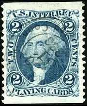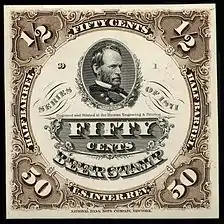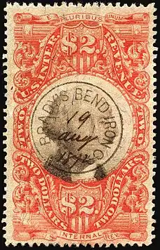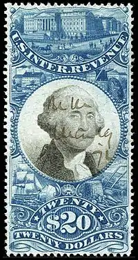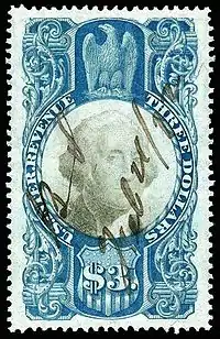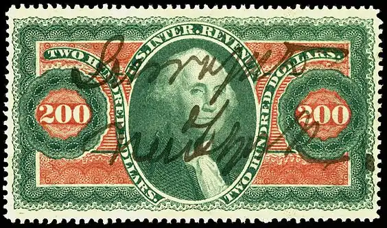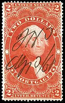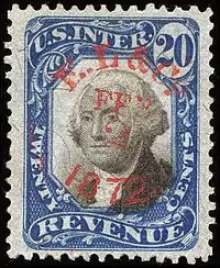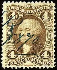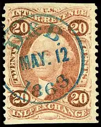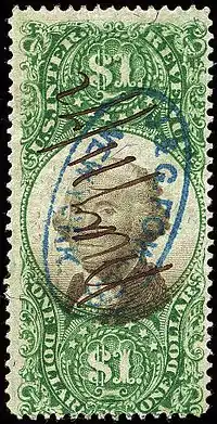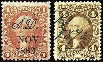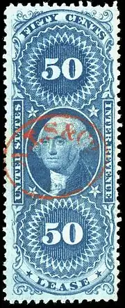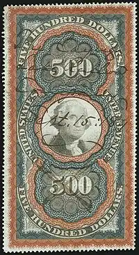 The second issue of revenue stamps were Documentary stamps and issued in 1871. After the Internal Revenue received many reports of the fraudulent re-use of revenue stamps, typically with cancellation ink washed or otherwise removed from the face of the stamp,[13] a letter of May 31, 1867 from government officials in Wall Street was sent to Internal Revenue commissioner E.A. Rollins expressing the concern that "The U.S. government loses thousands of dollars daily by stamps being used a second time." The ordinary stamps in use at this time did not receive the cancellation ink very well, unless it was heavily applied.[14] The letter advised that all stamps be printed in a pale yellow color. This particular suggestion however was not taken up by Butler & Carpenter, but instead, after a period of experimentation, they responded to the problem by producing stamps of a lighter shade and on a paper that more readily absorbed cancellation ink.[14] The Internal revenue was frequently sending stamps suspected of having cancellation ink washed to the engravers and printers for inspection to determine if they had been tampered with.[15]