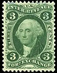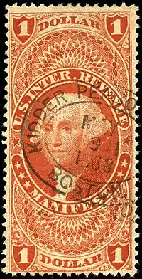 The first revenue stamps in the United States were used briefly during colonial times, among the most notable usage involved the Stamp Act. Long after independence, the first revenue stamps printed by the United States government were issued in the midst of the American Civil War, prompted by the urgent need to raise revenue to pay for the great costs it incurred. After the war ended however, revenue stamps and the taxes they represented still continued. Revenue stamps served to pay tax duties on items that came under two main categories, Proprietary and Documentary. Proprietary stamps paid tax duties on goods like alcohol and tobacco, and were also used for various services, while Documentary stamps paid duties on legal documents, mortgage deeds, stocks and a fair number of other legal dealings. Proprietary and Documentary stamps often bore these respective designations, while in several of the issues they shared the same designs, sometimes with minor variations. Beginning in 1862 the first revenue stamps were issued, and would continue to be used for another hundred years and more. For the first twelve years George Washington was the only subject featured on U.S. revenue stamps, when in 1875 an allegorical figure of Liberty finally appeared. Revenue stamps were printed in many varieties and denominations and are widely sought after by collectors and historians. Revenue stamps were finally discontinued on December 31, 1967.