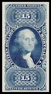 The first series of revenue stamps have two distinctive design types with each stamp designating the tax 'duty'. Designs for denominations 1-cent through 20-cents were simple, bearing a portrait of George Washington, while stamps with denominations 25-cents through 1-dollar are larger and have a more elaborate design and also designate the tax duty in a lower banner. Stamps with denominations of $1.30 were used to pay the tax duty for foreign exchange only, $1.50 for Inland exchange only while the stamps with denominations of $1.60 and $1.90 were for Foreign exchange only and oddly bear no duty designations in the stamp design. Denominations of 2-dollars through 10-dollars have tax duties designated in the lower circular banner surrounding Washington's portrait. Denominations of 15-dollars through 50-dollars have tax duties designated in the right side of the circular banner surrounding the portrait. The design used for the 1-cent denomination is unique and is not used for any other denomination.[11]