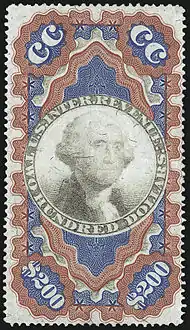 The new stamps were printed in several colors and depicted a portrait of George Washington on all thirty denominations from one-cent to $200.[6] The engraved image of Washington was modeled after a painting by Gilbert Stuart.[7] The first issues were printed on hard brittle paper and later printed on soft woven paper of varying thicknesses. Colors were generally dull for stamps printed before 1868. The stamps were issued in sheets perforated with 12 gauge perforations or 'imperforate', i.e.solid sheets with no perforations.[5] Washington remained the only figure on the dozens of varieties issued up until 1874.[8]
