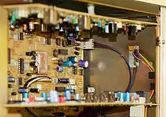 The B215 replay head amplifier used discrete JFET input and bipolar second stage; it drives the equalization stage—an active filter built around an operational amplifier in inverting configuration.[41] Subtle phase control networks in the active filter were tuned to best possible step response; Ludwig wrote that they enabled "square-wave reproduction off the tape of truly professional quality".[12] The signal then passes through a CMOS switch into the Dolby decoder, and then through another CMOS switch to output buffer stage.[41] A third set of CMOS switches engages to select 70 μs time constant instead of default 120 μs; as a result, during replay the signal passes through two or three CMOS switches, plus the switches inside the Dolby decoder.[41] The switches inevitably inject their own distortion products into the signal; their performance may be improved by replacement of stock 14000-series switches for newer pin-compatible low-impedance ICs. Line output level is fixed and is unusually "hot" for consumer audio: 775 mV RMS for nominal magnetization level of 250 nWb/m.[42] Headphone output has eight selectable volume settings, which is sufficient for practical use.[20]