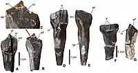 Rhabdodontids have a simple dentition with leaf-shaped teeth used for a powerful scissors-like shearing. These teeth are well-suited to a diet hypothesised to have consisted of tough and fibrous plants such as Sabalites and Pandanites.[4] Each tooth has a ridge on it that is offset from the midline of the tooth. These ridges also have a specific pattern which is unique to Rhabdodontids: their dentary teeth have a central primary ridge with multiple equally spaced secondary ridges, and their maxillary teeth have no primary ridge and have similarly-sized secondary ridges.[1][3][4]