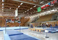 After a modification of the hall for younger gymnasts, competitions in the Swiss categories introductory program to program 4 take place on Sunday exclusively for Swiss junior gymnasts aged six to 13 years. Since these competitions are part of the Ostschweizer Cup (Eastern Swiss Cup),[11][12] gymnasts mainly from these regions take part. In addition to the organizing TZ Rheintal, this also includes the gymnastics centers in Fürstenland and Graubünden, the Turnfabrik (gymnatics factury) in the canton of Thurgau and, from program 3 on, the Regionales Leistungszentrum Ost (Regional Performance Center East) in Wil. In addition to the gymnasts from Eastern Switzerland, juniors from other regions, for example from the cantons of Aargau, Schaffhausen and Zurich, also take part.[13] The competitions within the Ostschweizer Cup serve as qualification competitions for the Swiss Junior Championships and as a cantonal championship in St. Gallen.[14][6]