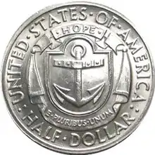 The Rhode Island Tercentenary half dollar (sometimes called the Providence, Rhode Island, Tercentenary half dollar) is a commemorative fifty-cent piece struck by the United States Bureau of the Mint in 1936. The coin was designed by John Howard Benson and Arthur Graham Carey. Its obverse depicts Roger Williams, founder of the Colony of Rhode Island and Providence Plantations. It was intended to honor the 300th anniversary of Providence, Rhode Island, although it bears no mention of the city.