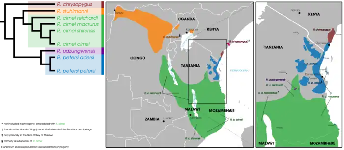 R. chrysopyguus, R. cirnei, and R. petersi are allopatrically distributed; with the more recently discovered R. udzungwensis and subspecies R. cirnei reichardi exhibiting parapatric distributions.[16] Some introgression (hybridization) has taken place between R. udzungwensis and R. cirnei reichardi as detected by mtDNA.[16]