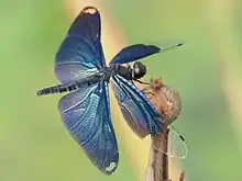 Rhyothemis fuliginosa is a short and stout dragonfly with a body length of 32-41 millimeters in length. The wings are 30–40 mm across and patterned with a deep blue iridescent shade.[11][3] Depending on the viewing angle, the dragonfly's wings can vary in color due to their light scattering properties, with some appearing golden in the light.[4][9] The wing patterns are thought to be a determinant between members of the same species to avoid mating with the incorrect partner.[3]