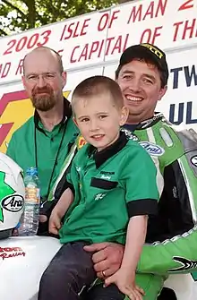 ![]() Richard Britton with son Loris and Mechanic Davy Lappin on the Isle of Man TT 400 podium in 2003 | |||||||||||