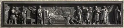 It stands on a granite pedestal also designed by Marochetti and made by Freeman & Co. of Penryn, Cornwall.[2] Bas-relief panels showing Crusaders fighting the Saracens at the Battle of Ascalon and Richard on his deathbed pardoning Bertran de Gourdon, the archer who fatally shot him in 1199, were added to the east and west sides of the pedestal in 1866–67.[3] As the statue cannot be accessed by the general public – the area around it is used as the House of Lords car park – the west-side scene showing Richard and Bertran is the only one visible from the street. According to Marochetti, the two bas-reliefs were designed in the style of Lorenzo Ghiberti's doors at the Florence Baptistry.[4] Bronze letters on the front of the pedestal bear the inscription RICHARD I CŒUR DE LION / 1189–1199.