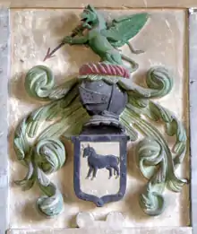Heraldic achievement of Richard Cole, detail from top of his monument. The gold bezants in the bordure have been overpainted black