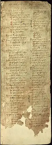 Richard Hill's Commonplace Book describes itself as "A Boke of dyueris tales and balettes and dyueris Reconynges etc". Its contents are extraordinarily varied, including treatises on polite behaviour and arithmetic, notes on events in Hill's family, collected proverbs,[4] literature, riddles,[6] chronicles, a French conversation manual, and instructions on breaking horses, conjuring with cards, and making rat poison.[2] Its texts of late medieval carols and other lyrics are especially notable. It is a source for such poems as "The Corpus Christi Carol", "The Boar's Head Carol", "Gentill butler, bell ami", "Make we mery bothe more and lasse", "Alas, my hart will brek in three", "Holy bereth beris", "Draw me nere", "What cher? Gud cher, gud cher, gud cher", and "O marcyfull God, maker of all mankynd".[8][9] It also includes John Lydgate's "The Virtues of the Mass" and "The Churl and the Bird", Thomas More's "Fortune Verses", the anonymous "Nut-Brown Maid" and The Seven Sages of Rome, "The Treatise of London" (sometimes attributed to William Dunbar), and extracts from John Gower's Confessio Amantis.[4]