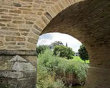 The Richmond Bridge is constructed of sandstone quarried from Butchers Hill, hauled to the construction site by convicts using hand carts. It consists of four main arches, of span 4.3, 8.1, 8.3, 8.5, 8.3 and 4.1 metres (14.1, 26.6, 27.2, 27.9, 27.2, and 13.5 ft), respectively, which spring from sloping fins with angular leading edges aligned with the flow of to the lake.