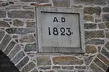 The 1825 depiction shows the Bridge did not at its completion have the 1823 stone plaques attached above its central pier; the three middle piers were originally traditional vertical cutwaters identical to the two piers as still seen today at water's edge, and did not have the quite bulky elongated hexagonal plan cutwaters (added in 1884/5); and the townside bridge approach followed the same gentle downward slope design as still exists at the eastern end and as seen in the lower road level string course. This modification was made in 1834/5 and was undertaken for bridge approach safety reasons. The bronze plaque is a recent addition on the roadside inner wall, added in 1991.