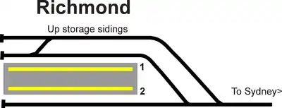 This Wikipedia article contains material from Richmond Railway Station and yard group, entry number 01236 in the New South Wales State Heritage Register published by the State of New South Wales (Department of Planning and Environment) 2018 under CC-BY 4.0 licence, accessed on 2 June 2018.